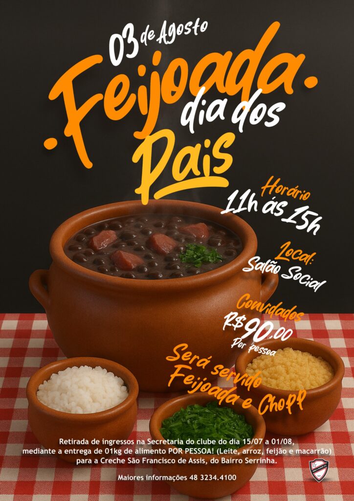 O Clube Paula Ramos convida a todos para um almoço especial em homenagem aos pais! No dia 3 de agosto (domingo), das 11h às 15h, prepare-se para saborear uma autêntica feijoada no Salão Social, acompanhada de chopp gelado para completar a experiência.